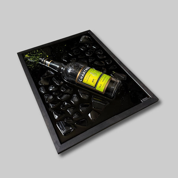 Les bouteilles intégrées dans nos tableaux sont des objets recyclés issus de produits légalement acquis. Elles sont utilisées uniquement en tant qu’éléments décoratifs et ne constituent ni une exploitation commerciale de la marque, ni une reproduction destinée à créer une confusion avec les produits originaux.