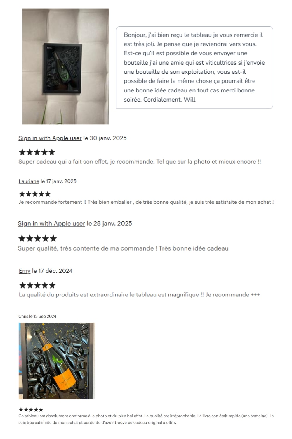 Il suffit de vous rentre sur la page Votre tableau personnalisé et de suivre toutes les indications ! Nous nous ferons un plaisir de personnaliser votre bouteille.